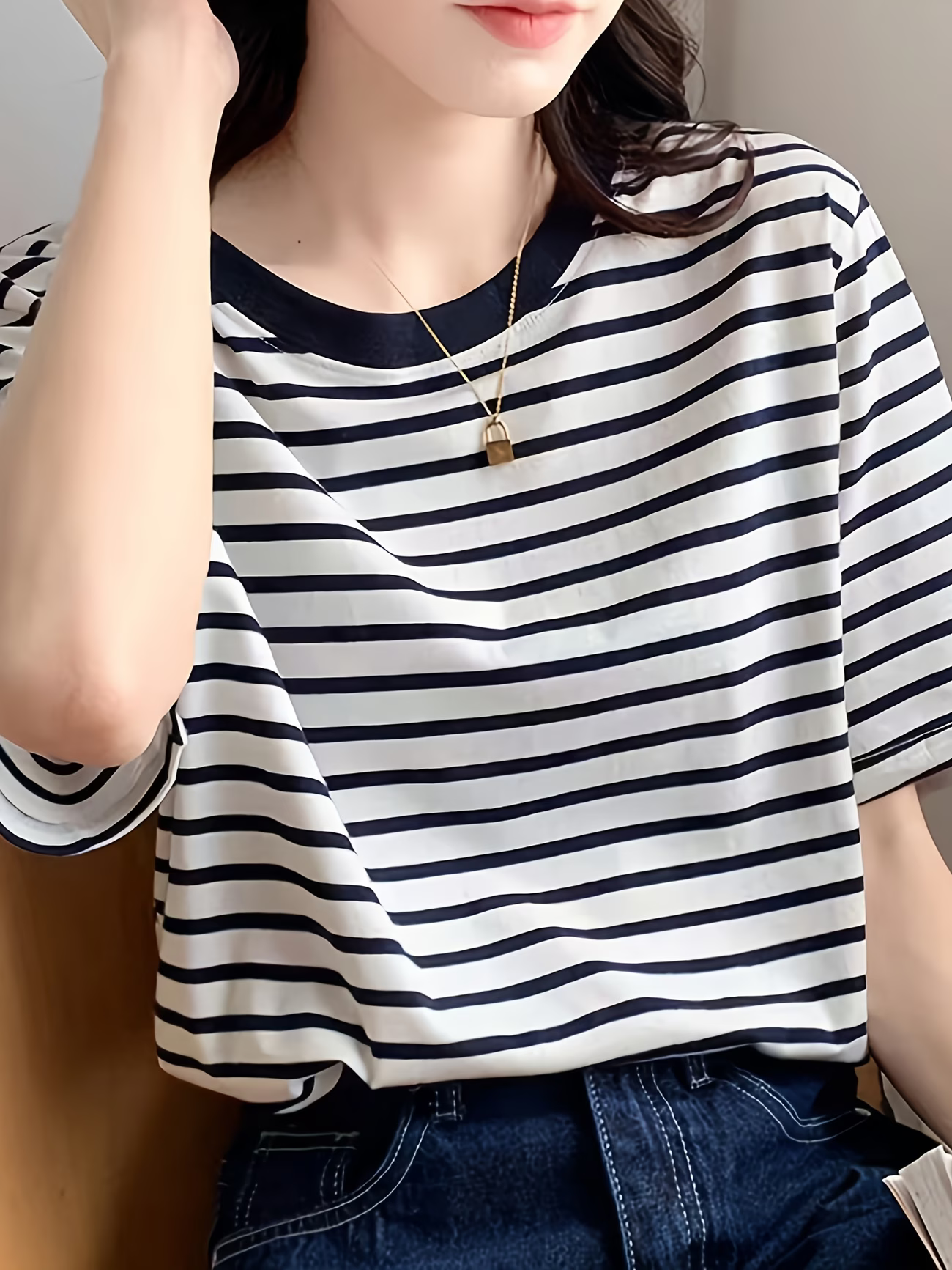 Loose-fitting Versatile Green Striped Hong Kong-style Vintage T-shirt, Chic Short-sleeved Top for Summer 2026