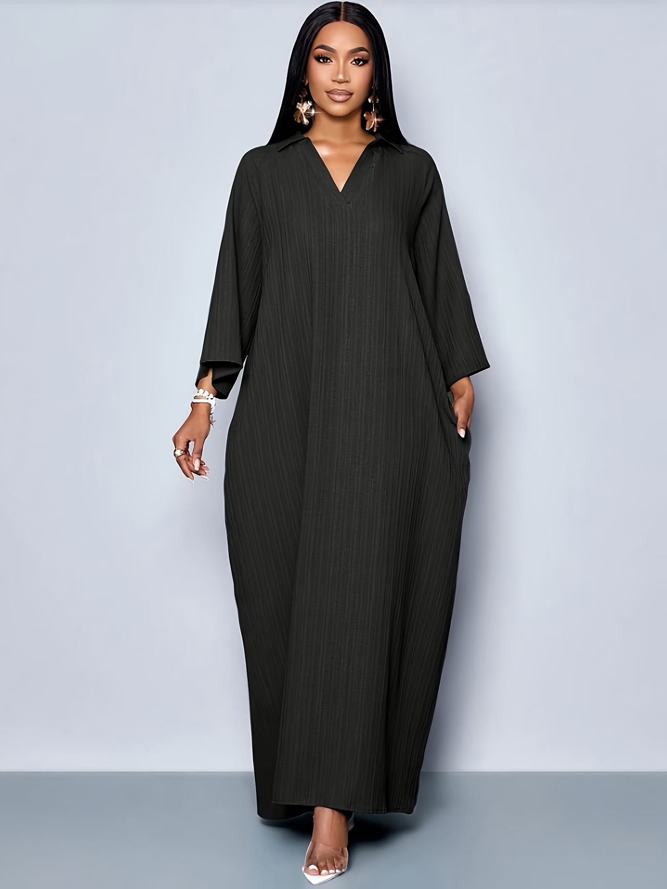 Women’S Fashion V-neck Loose Batwing Sleeve Dress | Solid Color, Flared Hem, Pocket Details, All-season Wear